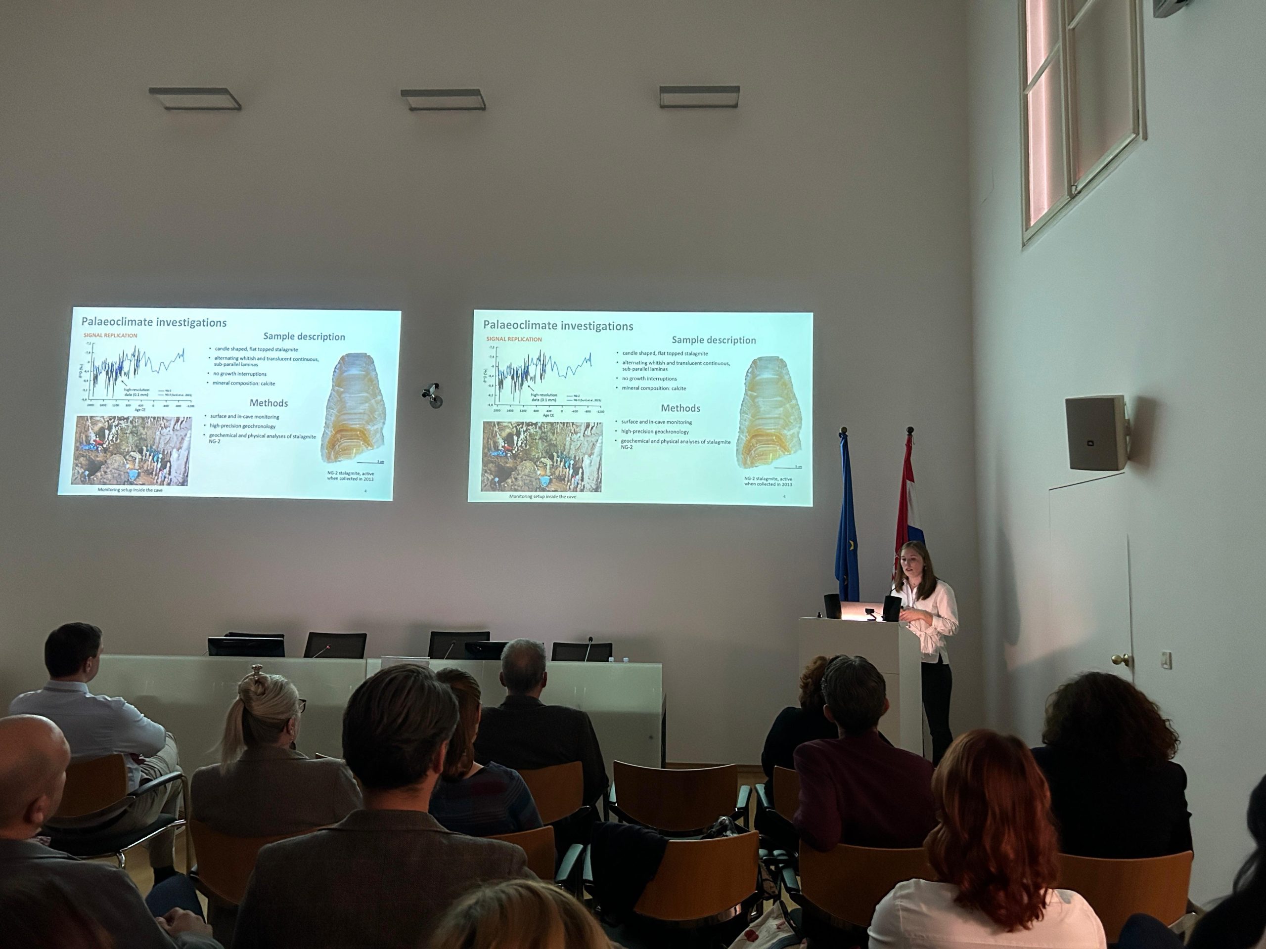The scientific program featured lectures spanning a range of disciplines related to Quaternary geology, including karst research, paleontology, tectonics, as well as palaeoclimatology. Among the speakers, Iva presented the first results of her ongoing PhD research entitled: „Late Holocene climate recontructions using stable isotope records of a stalagmite from Nova Grgosova Cave (central Croatia)“. On the second day, following the lectures, participants took part in field excursions to Veternica Cave, guided by Andrej Stroj, Damir Lacković and Jandranka Mauch Lenardić, and to the Nova Grgosova Cave, led by Petra Bajo, Iva Palatinuš, Andrej Stroj and Tomislav Kurečić.